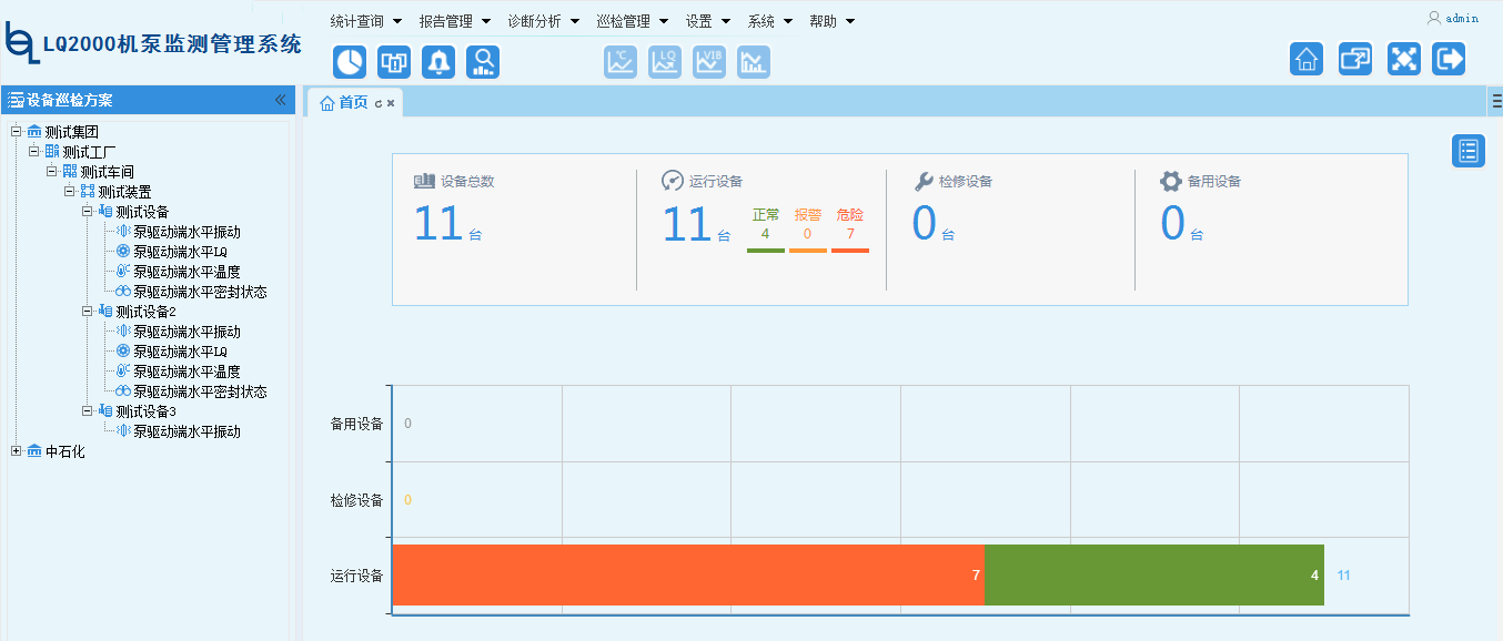 上位機分析軟件具有振動波形頻譜分析、趨勢查詢、報警查詢、設備運行狀態(tài)查詢、設備數據統計報告、診斷報告編寫、巡檢計劃編制、設備管理功能。
